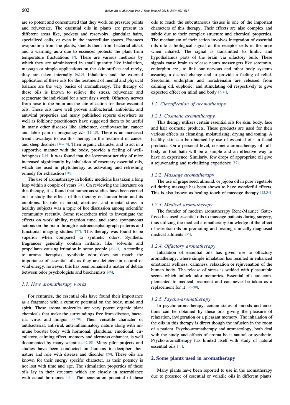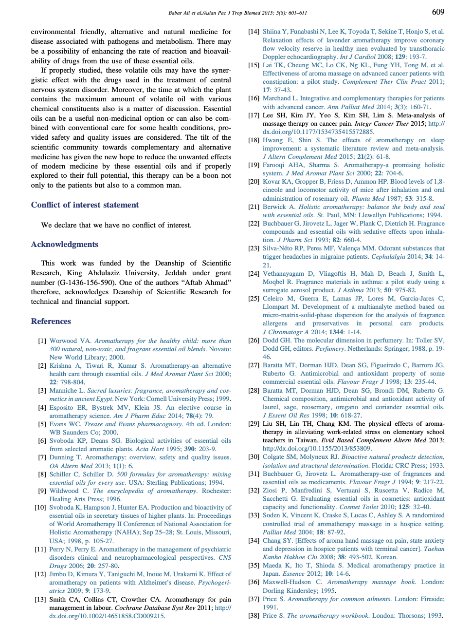 Nowadays, use of alternative and complementary therapies with mainstream medicine has gained the momentum. Aromatherapy is one of the complementary therapies which use essential oils as the major therapeutic agents to treat several diseases. The essential or volatile oils are extracted from the flowers, barks, stem, leaves, roots, fruits and other parts of the plant by various methods. It came into existence after the scientists deciphered the antiseptic and skin permeability properties of essential oils. Inhalation, local application and baths are the major methods used in aromatherapy that utilise these oils to penetrate the human skin surface with marked aura. Once the oils are in the system, they remodulate themselves and work in a friendly manner at the site of malfunction or at the affected area. This type of therapy utilises various permutation and combinations to get relief from numerous ailments like depression, indigestion, headache, insomnia, muscular pain, respiratory problems, skin ailments, swollen joints, urine associated complications etc. The essential oils are found to be more beneficial when other aspects of life and diet are given due consideration. This review explores the information available in the literature regarding therapeutic, medical, cosmetic, psychological, olfactory, massage aromatherapy, safety issues and different plants used in aromatherapy. All the available information was compiled from electronic databases such as Academic Journals, Ethnobotany, Google Scholar, PubMed, Science Direct, Web of Science, and library search.